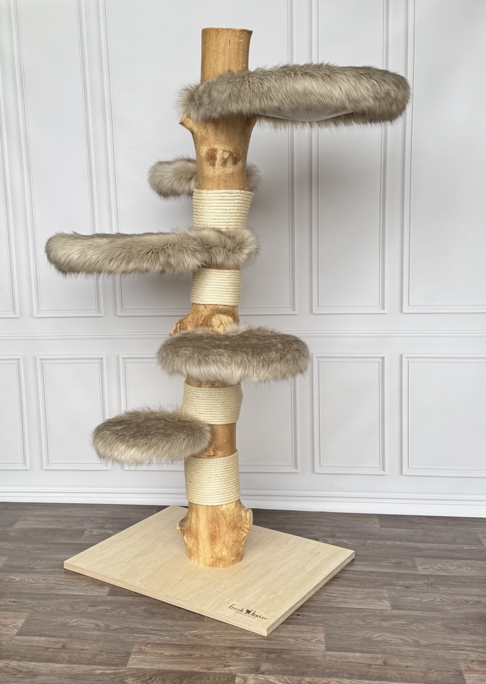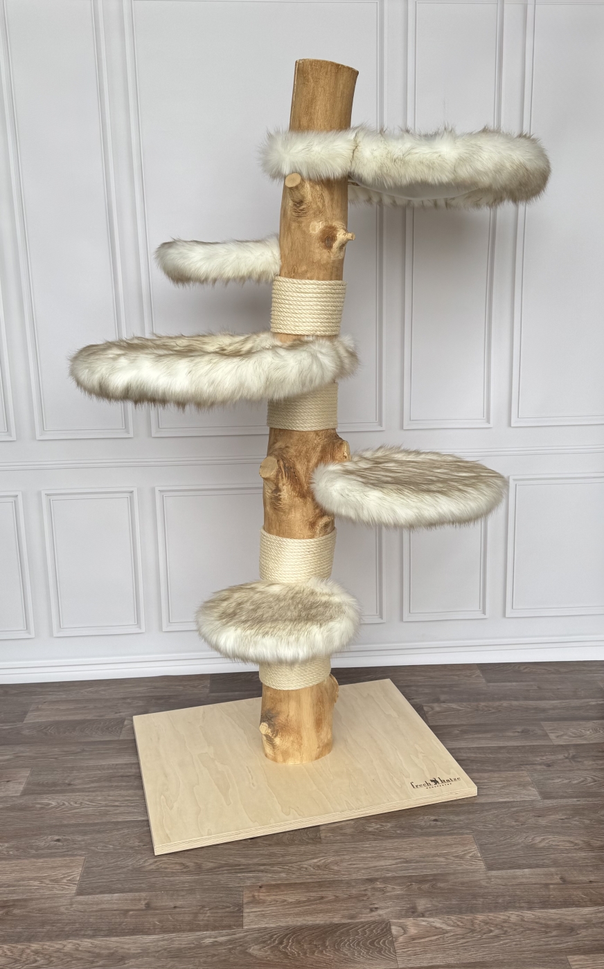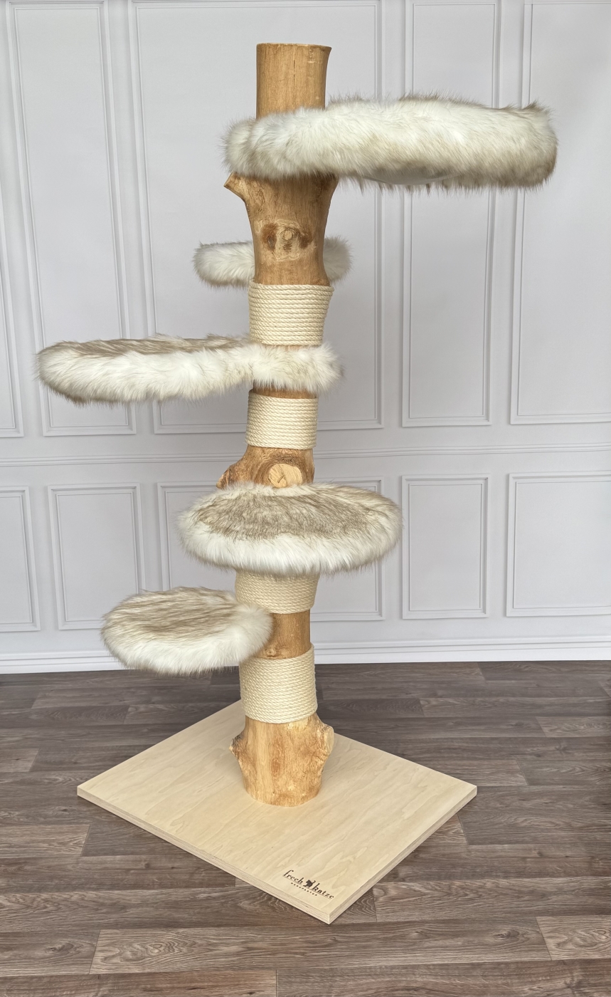 Dieser absolut massive 52 kg schwere Naturkratzbaum aus unbehandeltem Hartholz wurde von uns im Scandi Style ausgearbeitet. Es gibt 2 XXL gemütliche Liegemulden und eine extra große Liegefläche sowie 2 große Trittflächen mit hochwertigem Fellimitat.(Langflor; abnehm- und waschbar)